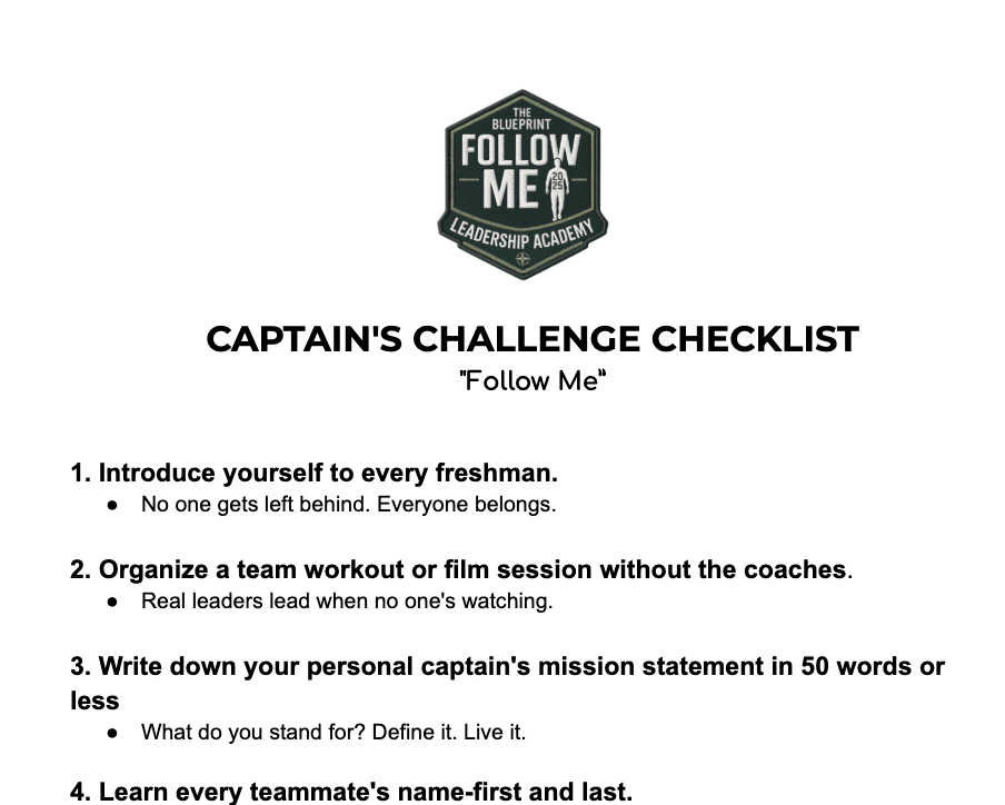 They’re eager to lead—but without a clear path, even your best athletes can struggle to turn potential into impact. The Blueprint Leadership Academy gives you a plug-and-play system built to develop captains who lead with purpose, presence, and consistency. Over 8 weeks, your leaders will be challenged through powerful real-world stories, reflective journaling, small group discussions, Self-guided Lessons