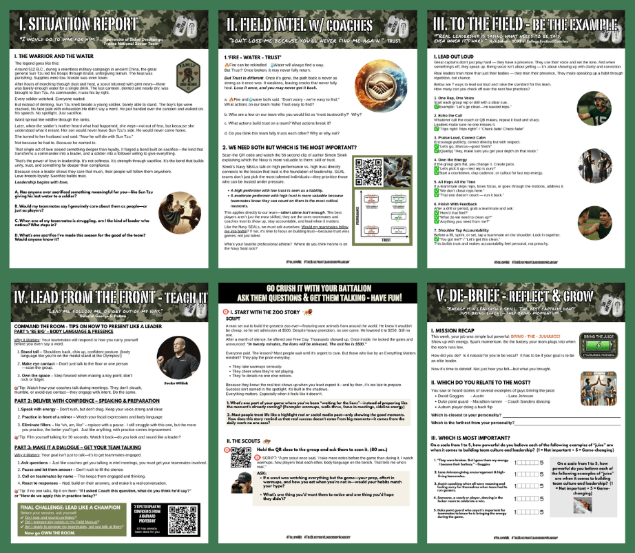 Each lesson includes QR codes linking to curated video clips—from sports, military, and film scenes—designed to bring leadership concepts to life and spark meaningful conversations. It’s a system that doesn’t just tell athletes how to lead—it shows them. All you have to do is hand them the field manual and walk with them through the process.